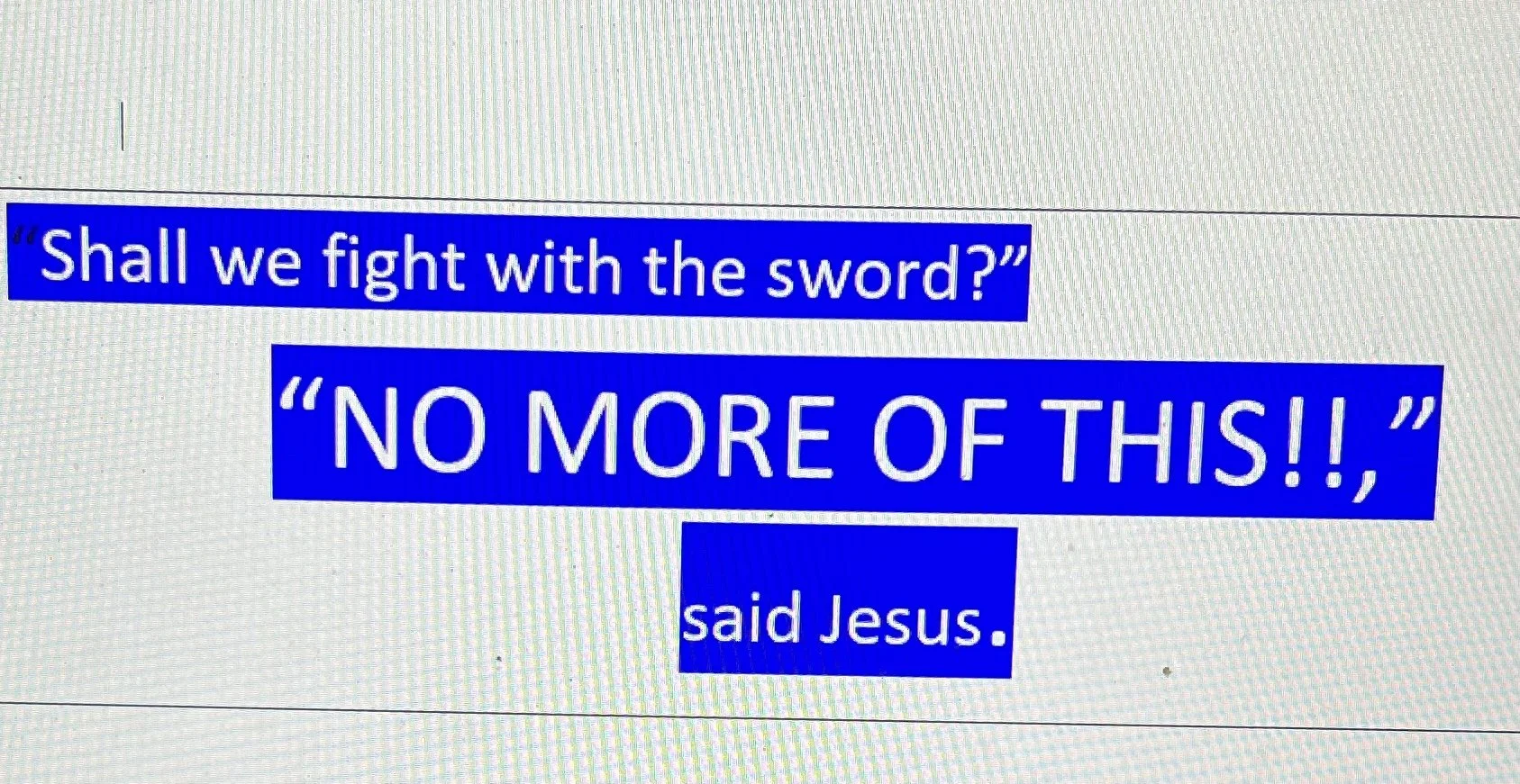 And, in the Garden of Gethsemane at the high, tense moment when Jesus was being arrested, Peter pulled out his sword and cut off the right ear of the servant of the high priest. (Not exactly the most violent action – compared to AR-15’s mowing down children). But at that moment – that highly emotional, tense moment of his betrayal and arrest, even that comparatively small act of violence drew a strong rebuke from Jesus. (See John 18: 10-12) Luke 22: 49-51 says that the disciples asked “Lord shall we strike with the sword?” and Jesus’ answer was clear: “No more of this!” In the Greek, the rebuke is the strongest possible language. “STOP IT!” In Matthew’s account (Matthew 26: 51,52), Jesus’ rejection of violence is expanded: “Put your sword back into its place; for all who take the sword will perish by the sword. Even in a critical time of deep personal agony, Jesus rejected even a small demonstration of violence. Friends, the way of violence is not the way of Jesus.